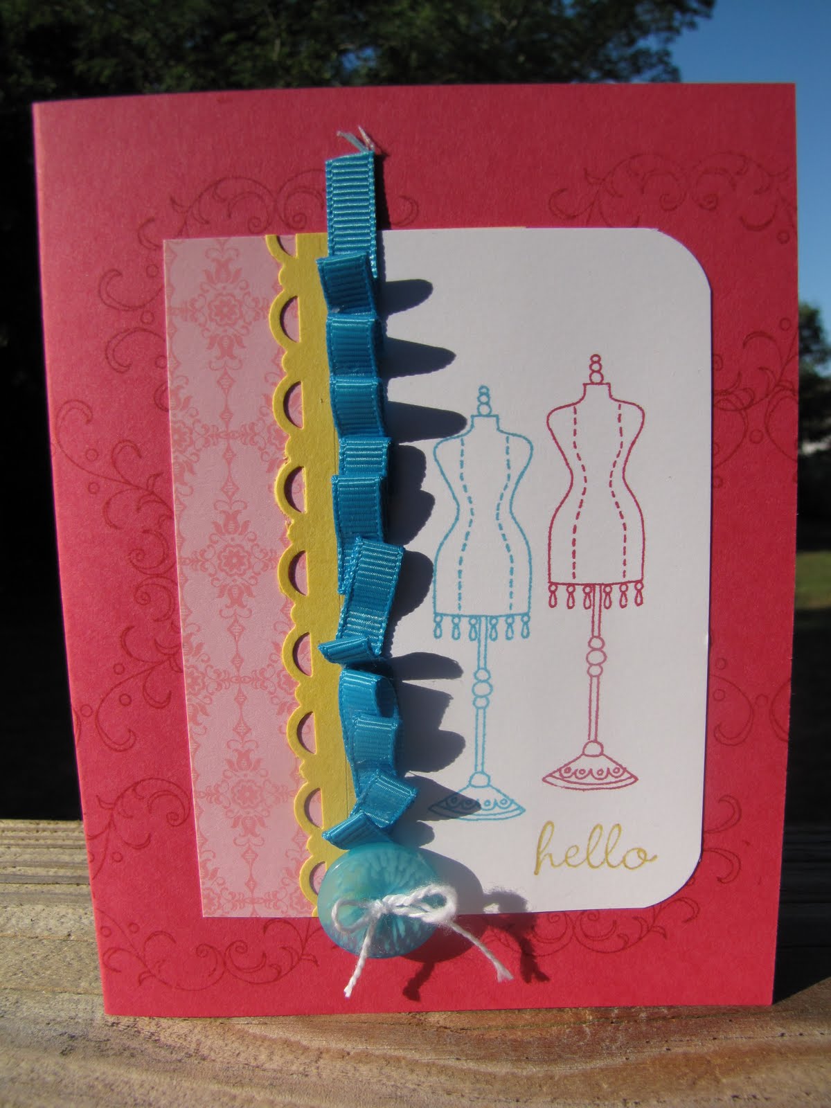 I wanted to have a sewn looking so I ruffled the ribbon along the card using sticky strip (this was before I had my adventures in sewing so now I could probably really sew it!)