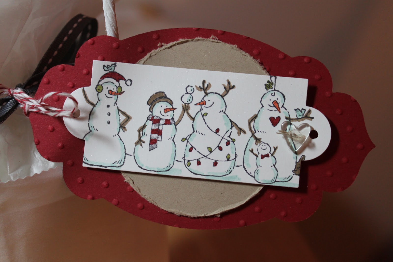 This tag features the Frosty Friends stamp, which is so stinkin’ cute (especially when you add glitter). I attached this lovely group of jolly snowpeople to the front of a hostess gift for one of my recent private classes. (Inside I tucked a cute little mason jar of snowman soup).
