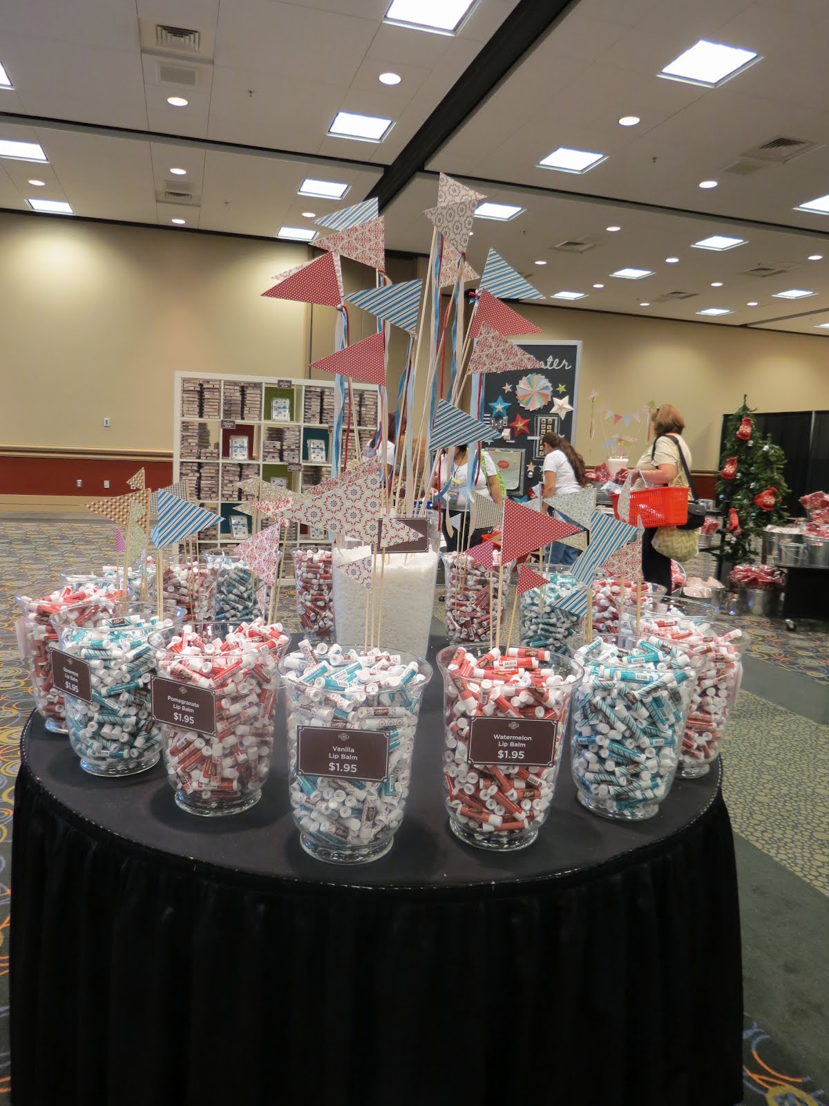 It’s the greatest little Stampin’ Up logo store available only during convention. Look at this sweet little display of Stampin’ Up branded chap sticks! There were four flavors: Watermelon, Pomegranate, Spearmint and Vanilla. That makes keeping your lips from chapping or burning super fun, right? And I love the cute little flag decorations — all made with fabulous SU product, of course.