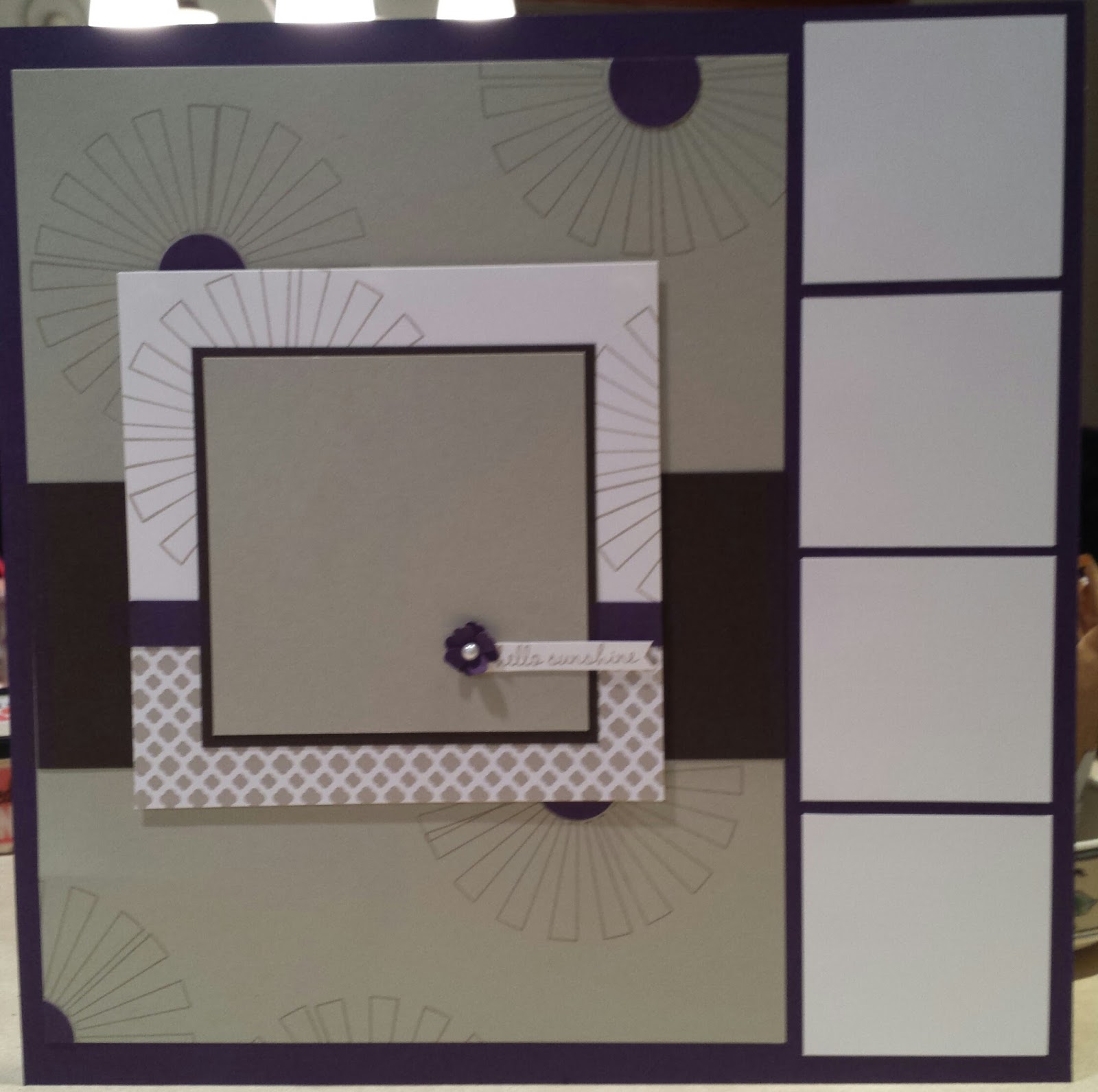 Finally, I take this 8.5×11 design and use it as the focal point on a 12×12 page. So for this page I put it on a 12×12 sheet of Elegant Eggplant. I kept the 8.5 x 11 page to the left and then put a strip of small white squares along the right side to use as photo mats.