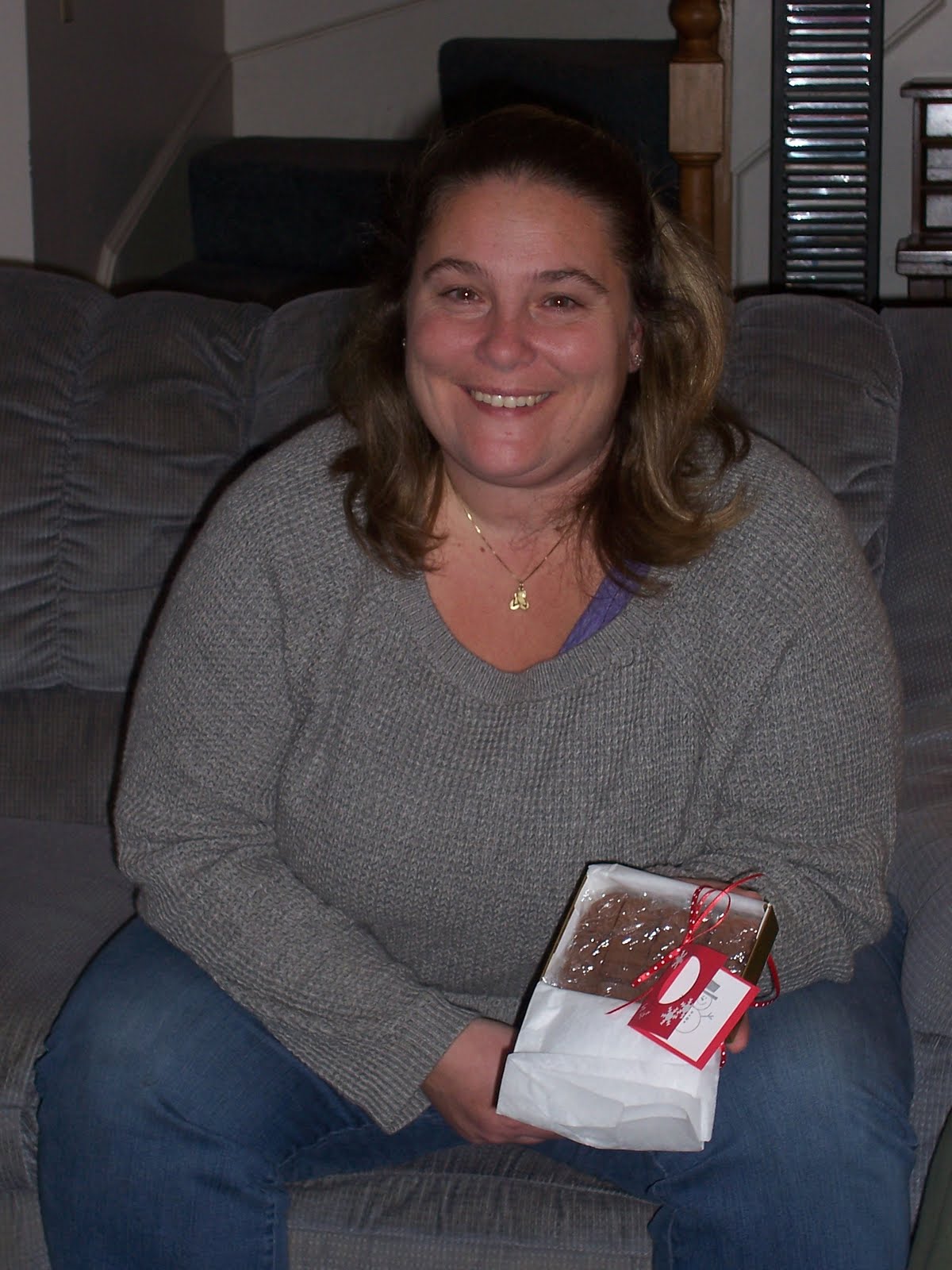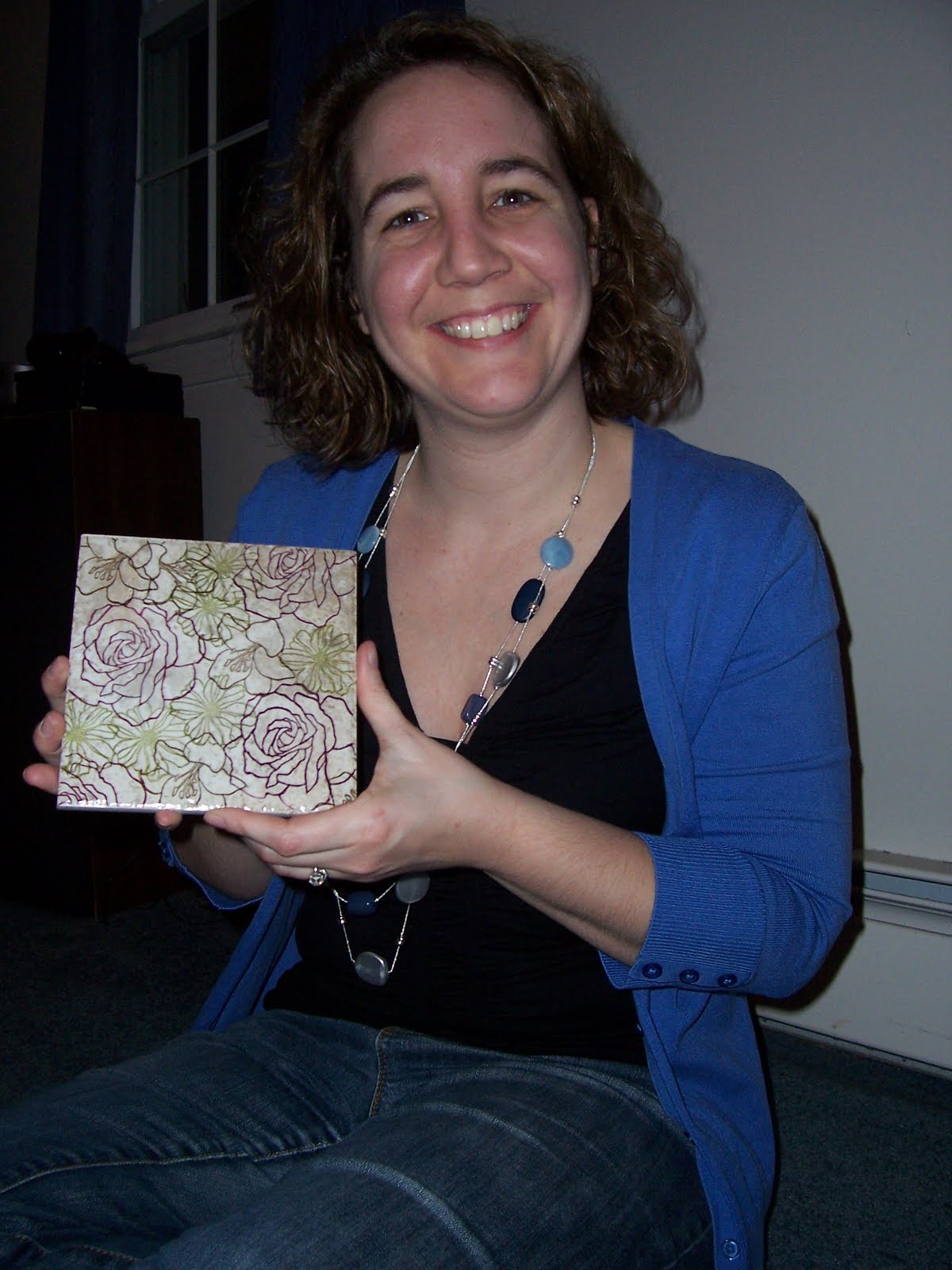We had some great gift giving, too! We did a homemade gift swap — make a gift, get one back! Here is Sally with her gift (designed by me), a journal jar: