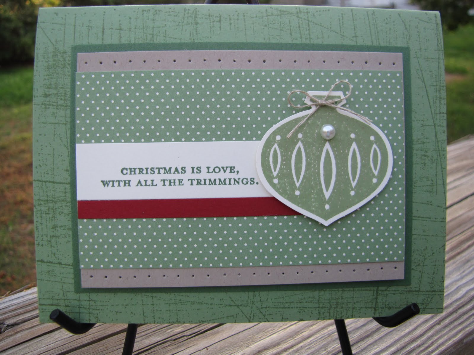 The card I’m featuring today is actually one from the three-part Holiday Card Classes I held for the past three months. I like how this one has a monotone feel except for the one pop of red. I used Contempo Christmas stamp set, Sanded background stamp, Woodland Walk DSP, the ornament punch and Wild Wasabi as the green.