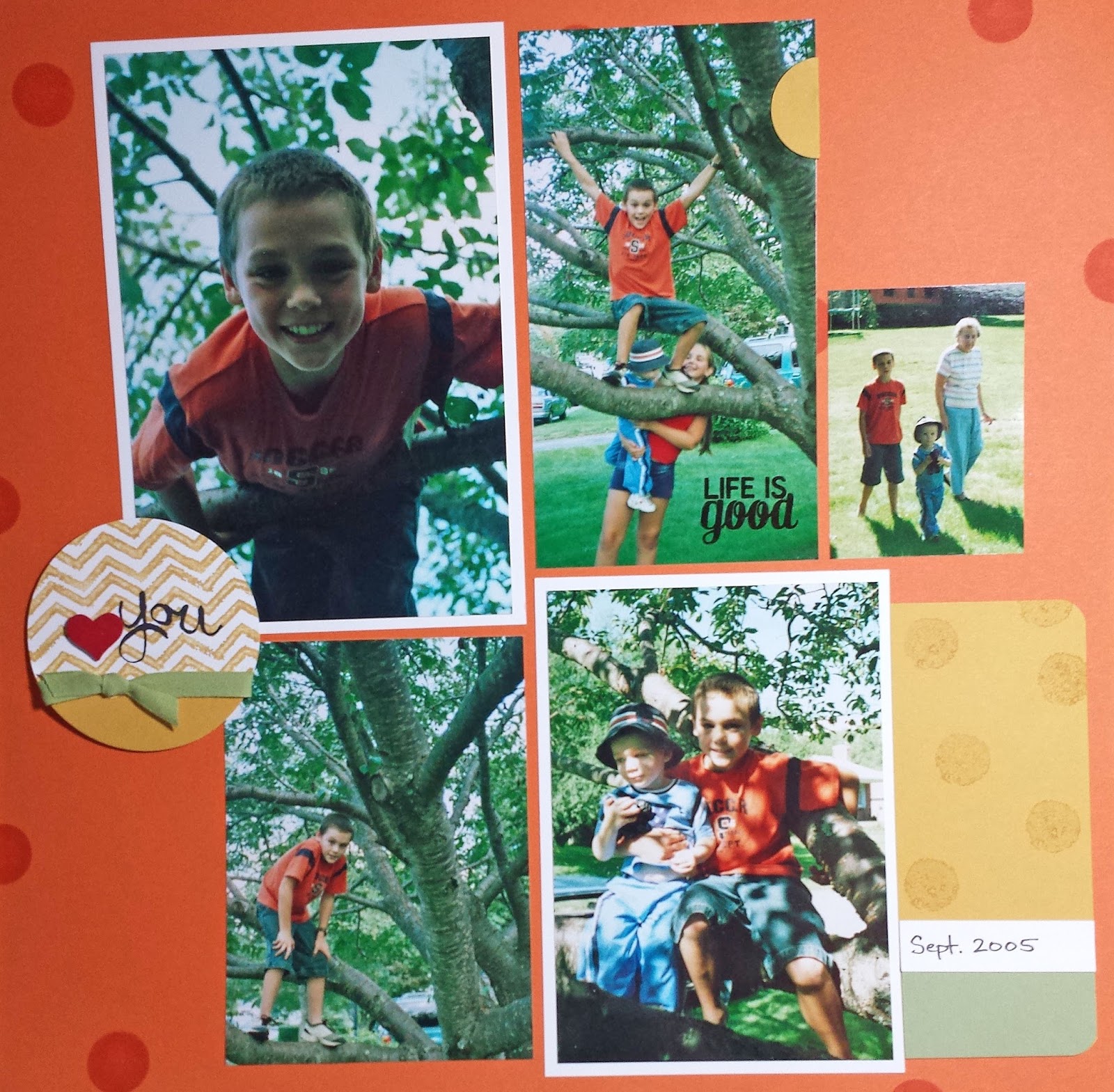 5. Create your own embellishment. See that focal point circle on the left (which is actually my title as well so two for the price of one here…)? I created my own stamped embellishment by stamping a pattern, decorating it with coordinating cardstock and ribbon and the putting my title on top. The best part about this technique? You ALWAYS have the correct color embellishment… and you never run out of them!