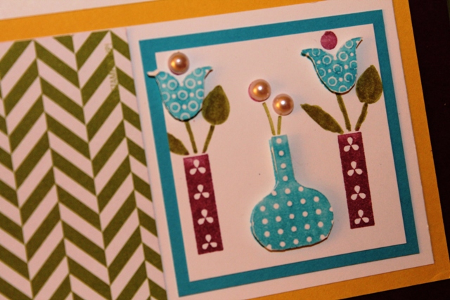 I used the Bright Blossoms stamp set to stamp three vases and flowers and then popped up the actual flowers using a stampin’ dimensional.