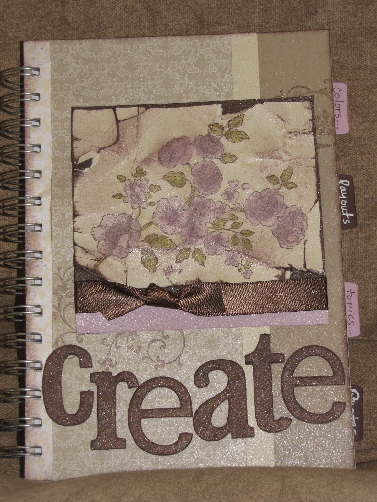 It is an idea journal so that when I am stumped for where to start a project or scrapbook page, I can pull out this handy, dandy book and get some quick inspiration. Inside, I have four categories. There is a section for color combos (clipping from magazines and such), layout ideas (sketches, clipping from magazines), another section for “topics,” which is where I will store ideas for pages or challenges I’d like to try (such as create a page about my current likes and dislikes or document the history of why I’m a little “frog,” etc.). The last section is for quotes. As an English major and a writer at heart, I love quotes. So this will be one little spot where I can keep all my favorites.