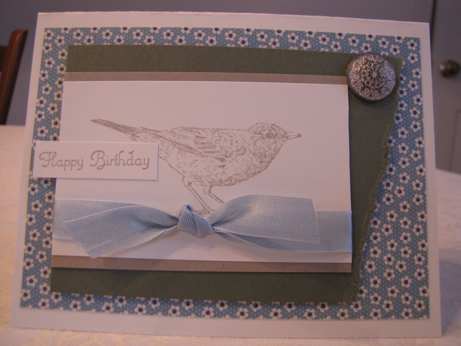 I do have a little sneak peek to show you today, too. This card was actually a make and take we made at my last meeting of local Stampin’ Up demonstrators. This card uses a new stamp set called “Nature Walk” and new paper called “Springtime Vintage.” For those of you in the Northeast, I thought you might enjoy a bit of Springtime 😉