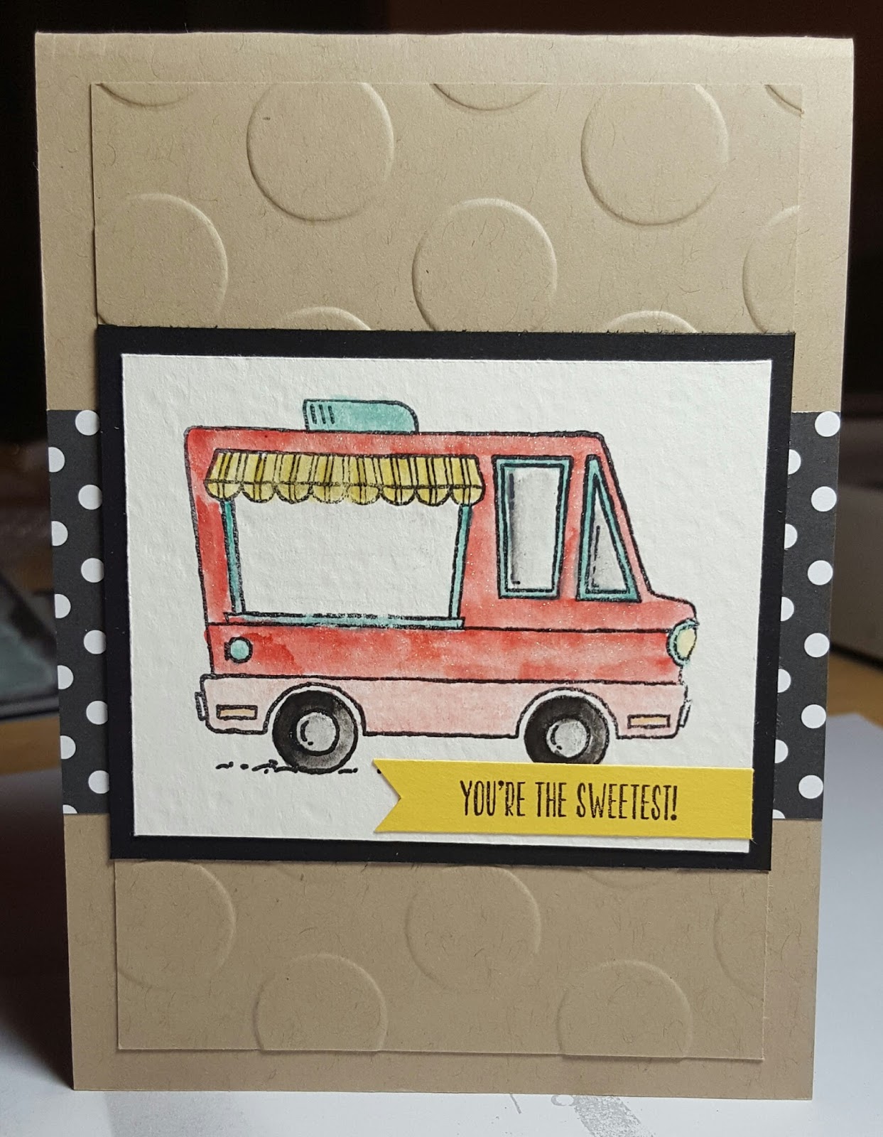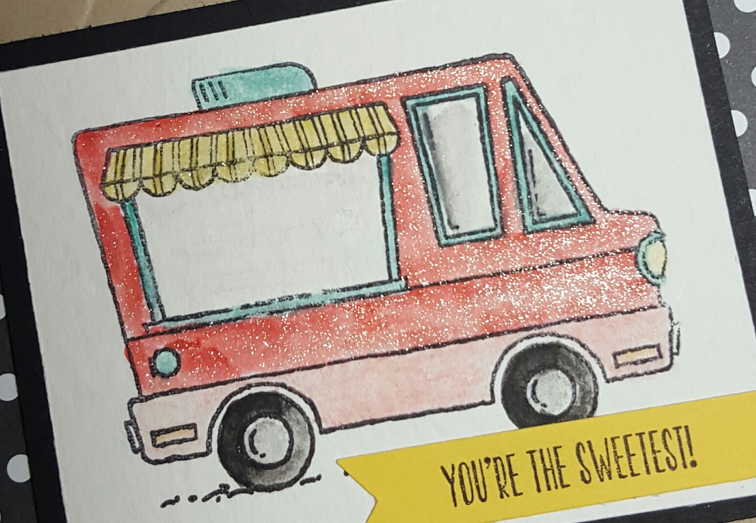 Is this little Ice Cream truck not the cutest? I had so much fun coloring some of these images last weekend. I used the watercolor paper, watercolor pencils and the aquapainter for this card. My favorite part of this card can’t really be seen in the image above, though. Check out how glittery this truck is!