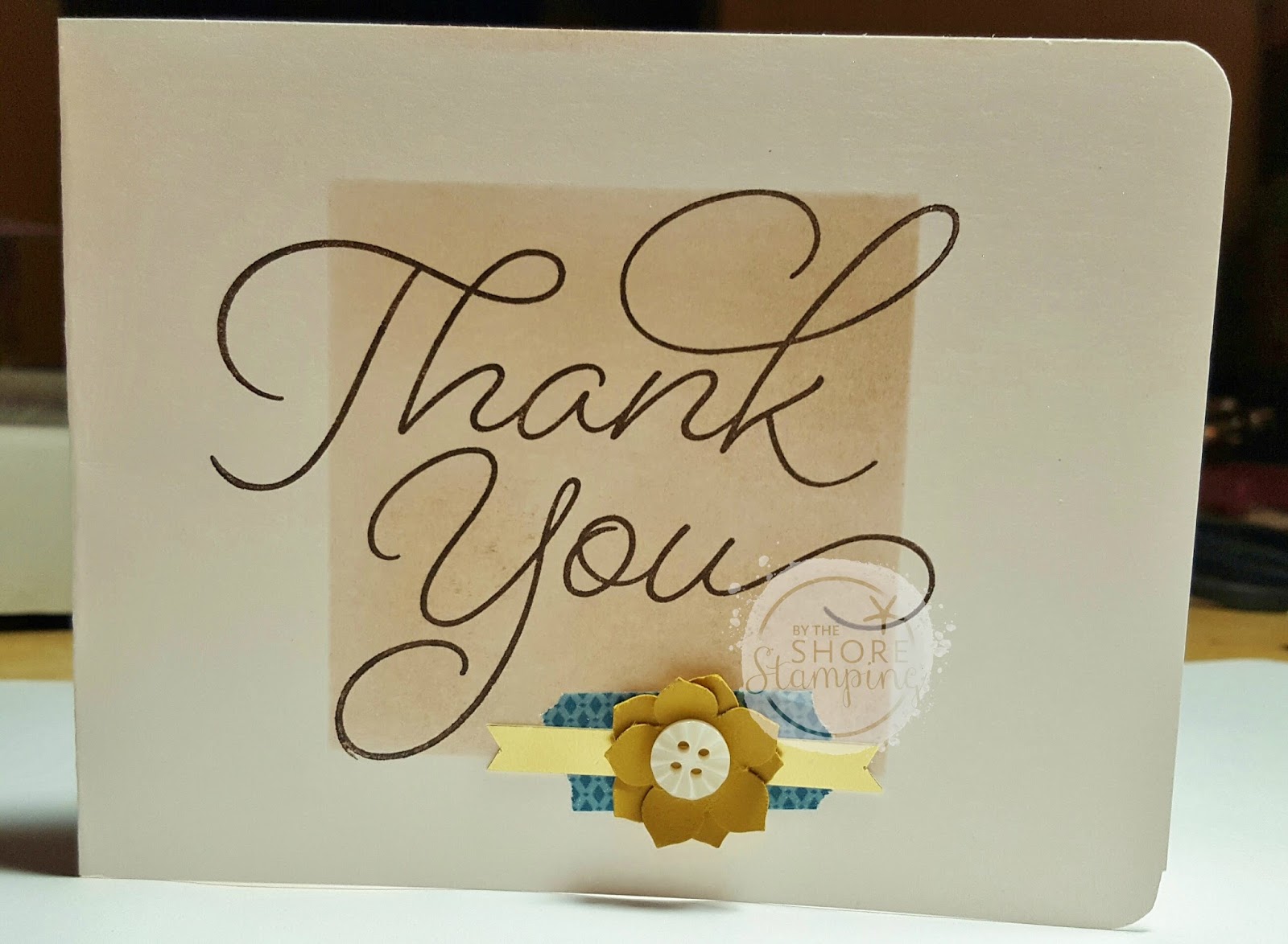 This first one is a little different. I used my Layering Squares Framelits to cut out a window in a scrap piece of paper. Then I used the negative piece to sponge Crumb Cake ink in the square cut out that was left behind. I then just simply stamped the “Thank you sentiment using Early Espresso ink. I added a small piece of the dapper denim Washi tape from the Moroccan Designer washi tape to the bottom edge of the inked square. I then took a tiny strip of gold foil cardstock and snipped “banner” ends in each side. Finally, I punched out two Delightful Dijon flowers using the petite petal punch and layered on top of each other with glue dots. The last element was to add one of the Classy Designer Buttons for the finishing touch.