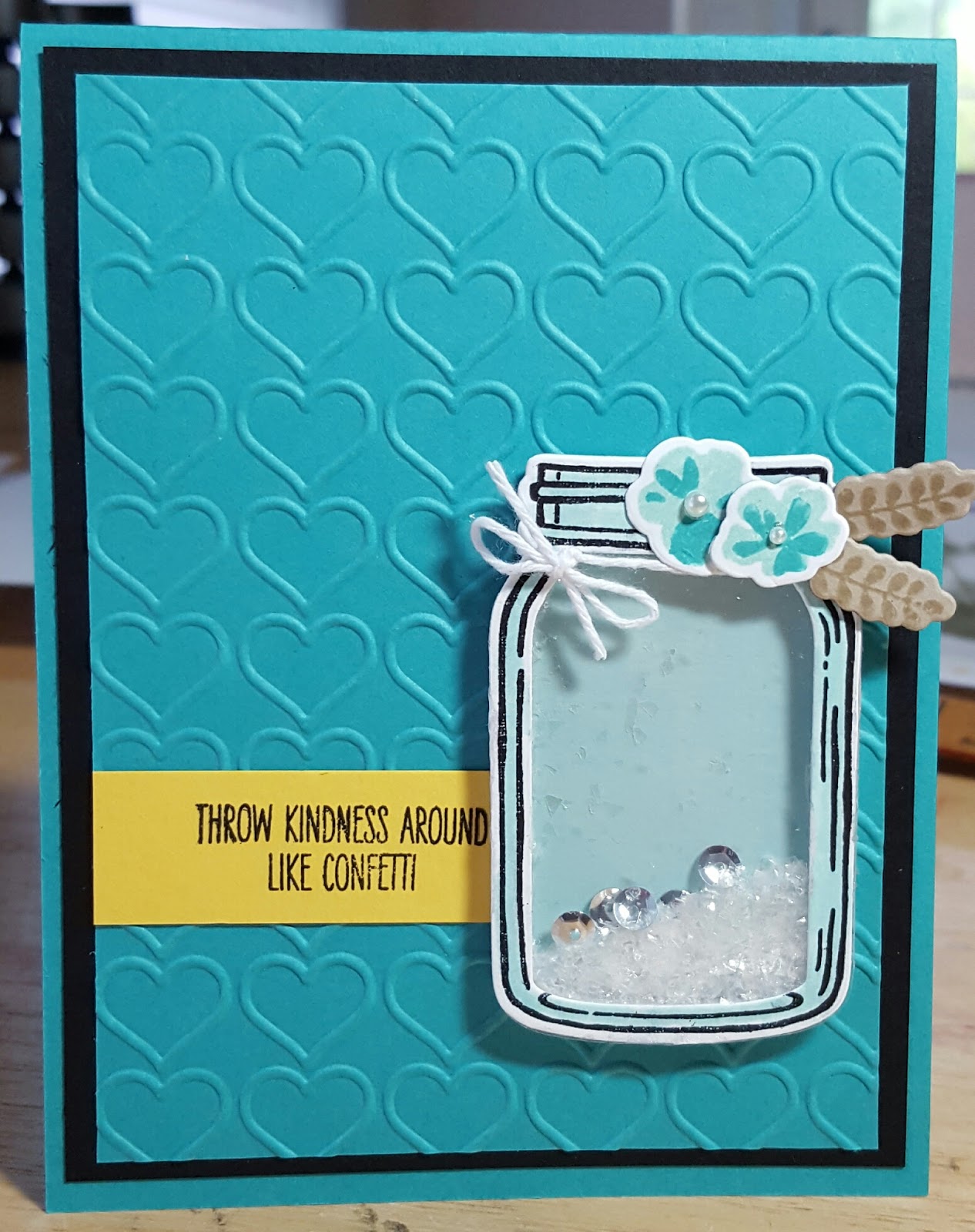 Here is the first one that started my shaker binge. It features the Jar of Love stamp set and the coordinating Everyday Jars framelits.