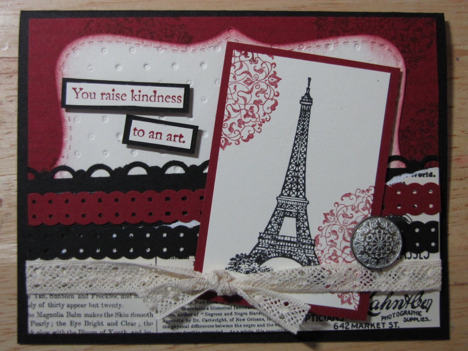 But it wasn’t working for me. There was too much open space on the top note die in the background and those two eyes were bugging me behind the Eiffel Tower image. I pulled out my Big Shot again and embossed the top note die, added some “hardware” and a sentiment.