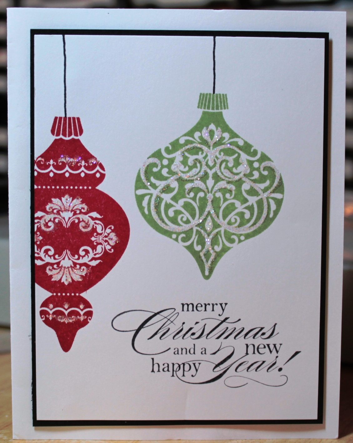 Anyway, the supplies for this one are: Ornament Keepsakes Stamp Set, Delightful Dozen Stamp Set, Dazzling Diamonds Glitter and the two way glue pen.