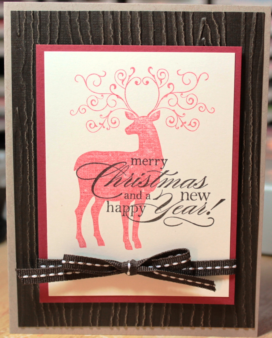 Here are the supplies I used for this card: Woodgrain embossing folder, Christmas Deer Stamp, Delightful Dozen Stamp set, Early Espresso Core’dinations Cardstock and Early Espresso stitched grosgrain ribbon.
