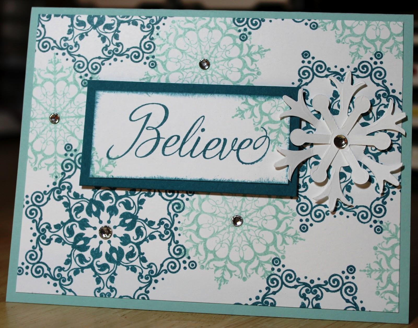 I like to have at least one “non-traditional” colors for the holiday. This one uses Pool Party and Island Indigo. I think they are the perfect colors for snowflakes. The stamp set is Snowflake Soiree from the Holiday catalog and I absolutely love it because it’s one of those stamp sets you just can’t go wrong with — especially went you create your own patterned paper like I did here.