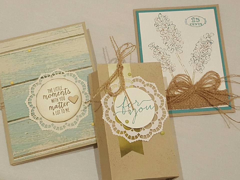 We made an envelope mini album, a “bagalope” using a Crumb Cake envelope and a card featuring the “thumping” technique.